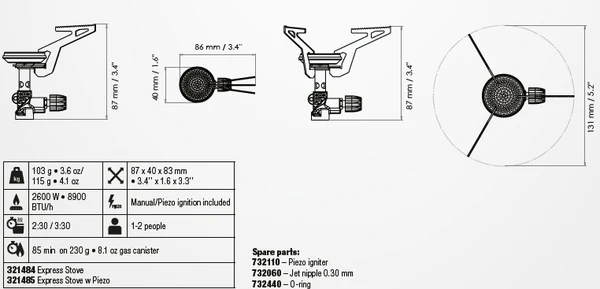 - 1 x Primus Express Stove Backpacking Kocher (mit oder ohne Piezo je nach Ausführung)