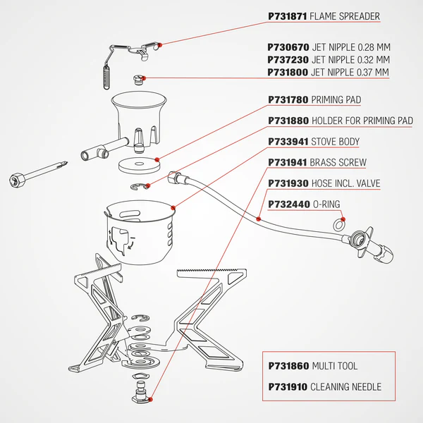Der Kocher verbrennt Kartuschengas, Reinbenzin, Petroleum, Diesel und Kerosin. Die deutlich markierten Düsen sind direkt an den Topfauflagen befestigt, sodass sie schnell gewechselt werden können. Mit der mitgelieferten ErgoPump wird Flüssigbrennstoff unter Druck gesetzt, alternativ kann eine Gaskartusche angeschlossen werden. Gas ist nicht im Lieferumfang enthalten.